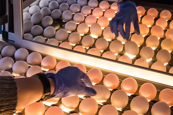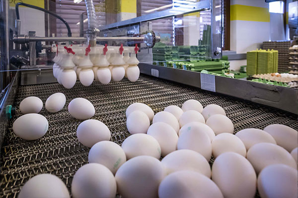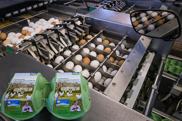 Nach dem Sammeln auf dem Bauernbetrieb gelangen die Eier direkt in unsere Produktionshalle. Dort werden sie schonend gereinigt und zuerst auf ihre Qualität geprüft: Jede Schale wird automatisch auf Risse und Defekte gescreent, sodass nur einwandfreie Eier weiterverarbeitet werden. Anschliessend sortieren wir die Eier präzise nach Grösse und Gewicht, bevor sie sorgfältig verpackt und für den Weiterverkauf vorbereitet werden. So stellen wir sicher, dass unsere Kundinnen und Kunden jederzeit frische, sichere und hochwertig sortierte Eier erhalten.